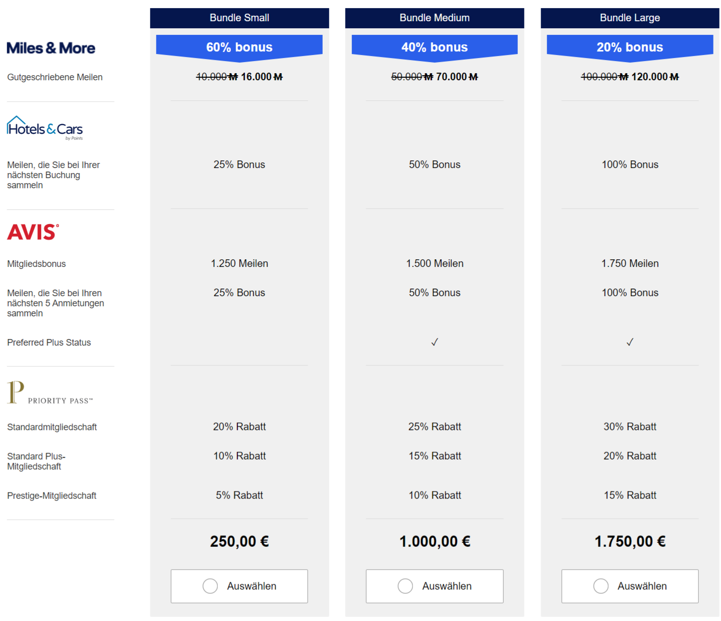 Jedes „Bundle and Go“-Paket besteht aus einer fixen Anzahl an Prämienmeilen sowie einem Meilenbonus auf die nächsten Buchungen bei Hotels and Cars. Außerdm erhaltet Ihr bei Avis den Preferred Plus Status, einen Mitgliedsbonus und ebenfalls einen prozentualen Meilenbonus auf Anmietungen von Fahrzeugen. Zu guter Letzt ergänzt noch ein preisreduzierter Priority Pass das Paket.