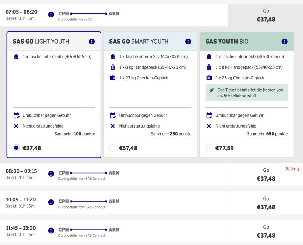 Es ist eigentlich ganz einfach, da ihr lediglich auf die gewohnte Buchungsseite von SAS gehen müsst und dort statt einem Erwachsenen, ein Ticket für „Jugend“ angebt. Beachtet, dass ihr Tickets für Jugendliche nicht mit anderen Altersgruppen kombinieren könnt. Falls ihr beispielsweise als Familie reist, kann es also hilfreich sein, die Buchungen zu splitten. Danach habt ihr die freie Auswahl, da die Streckenangebote kaum limitiert sind.