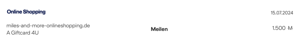 Hier habe ich noch einmal für 150 Euro Gutscheine gekauft und hierfür 1.500 Miles&More Meilen und über die Bezahlung mit der American Express Kreditkarte noch einmal 225 Membership Rewards Punkte (180 Meilen) bekommen. Die Meilen bei Miles&More sind übrigens nur Stunden nach dem Kauf schon gebucht.