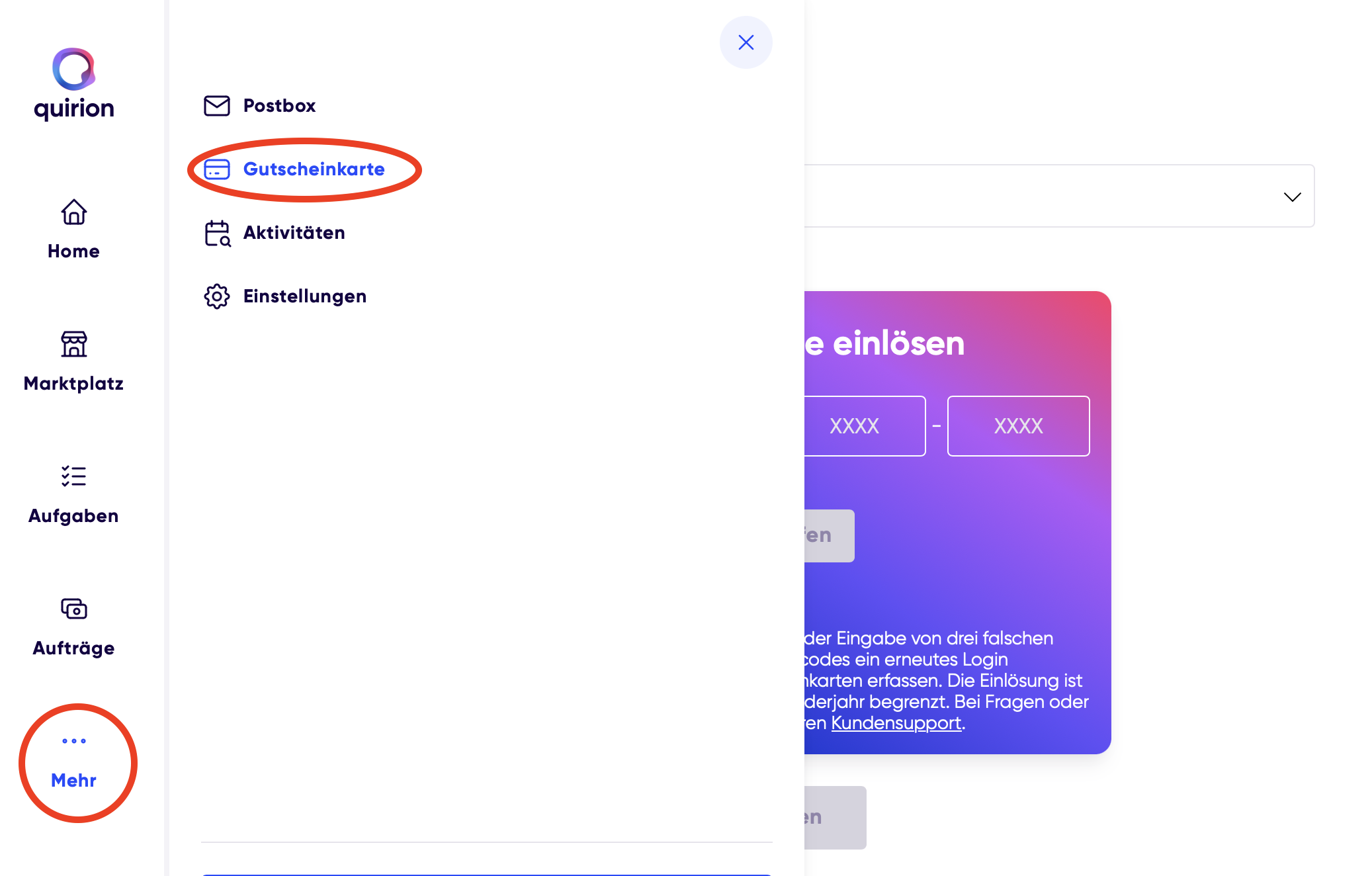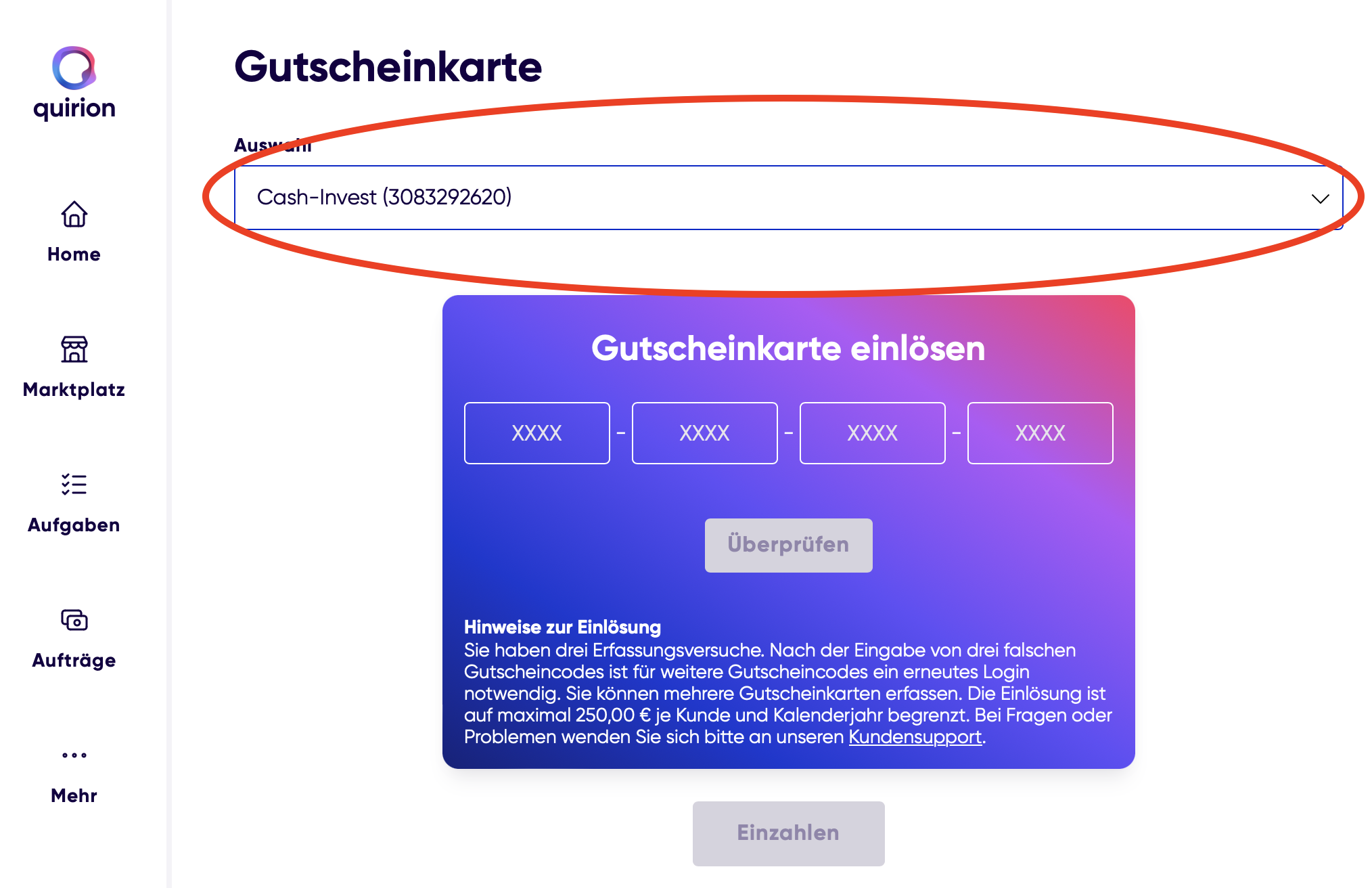 Das Einzahlen der Gutscheine ist dann grundsätzlich auch sehr einfach, wenn auch etwas versteckt, denn man muss nach dem Log-In auf „Mehr“ und hier auf „Gutscheinkarte“ klicken. Dort kann man dann den Code eingeben, den man mit dem Gutschein erhalten hat und das Geld einer Anlagestrategie hinzufügen.