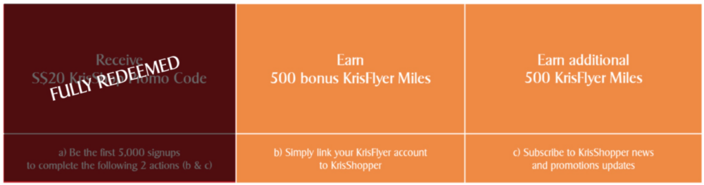 Derzeit läuft ein „Early Bird“-Special, welches aus zwei Promotions besteht. Bei der ersten bereits abgelaufenen Promotion hättet Ihr Euch einen 20 SGD Gutscheincode für den KrisShop sichern können. Die Aktion war jedoch auf 5.000 Gutscheine begrenzt und das ist bereits erschöpft.