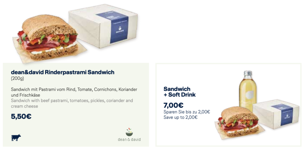 Im Januar hat Lufthansa bekanntgegeben, mit wem man beim Buy on Board-Konzept in Deutschland kooperieren will. Mit Dallmayr sowie dean&david hat man sich auf zwei Unternehmen aus Deutschland festgelegt. Heißgetränke und Süßwaren kommen von dem Münchener Delikatessenhaus, Salate & Sandwiches kreieren die Systemgastronomen von dean&david.