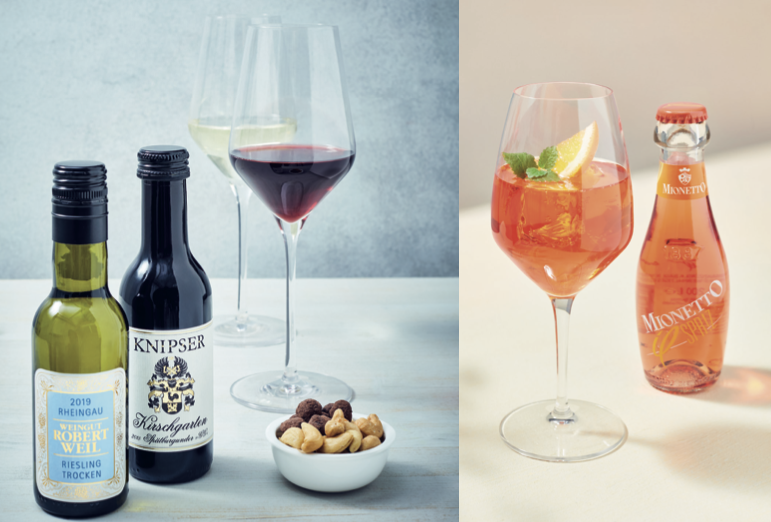 Das Sortiment steht ab 60 Minuten Flugzeit zur Verfügung. Auf innerdeutschen Strecken entfällt somit das Angebot. Immerhin bleibt jedem Gast eine Flasche Wasser und eine Mini-Schokolade. Für den Rest muss man künftig die Kreditkarte zücken. Wir werfen einen Blick auf das neue Angebot beim Kranich.