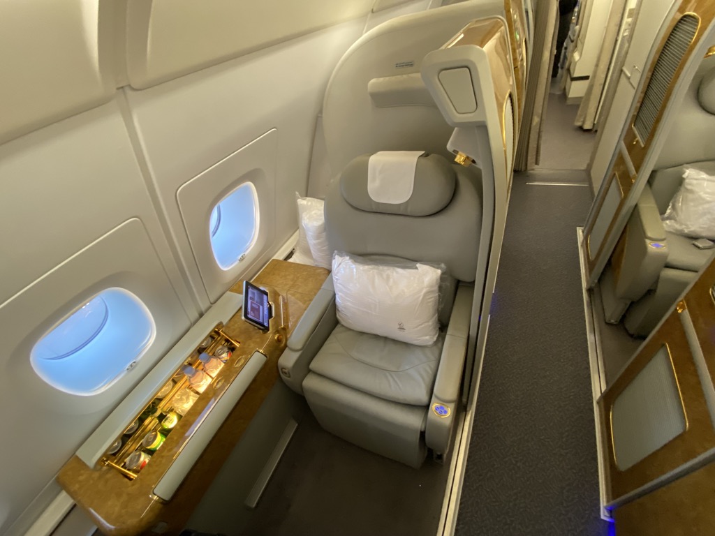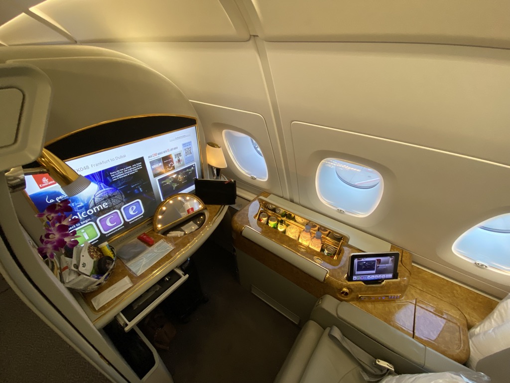 Ich wähle First auf Nachtflügen sehr explizit, weil in der Regel in der kleinen Kabine bei Abendabflügen der Service – wenn überhaupt- kurz und bündig ist, und dann das Licht abgelöscht wird.