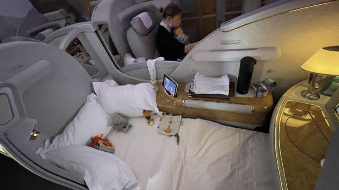 Es geht ja vielmehr um andere Aspekte. Also bei uns zumindest. Zum einen fliegen wir gerne weiter First und sehen keine Grund, warum wir das aufgeben sollten, nur weil wir jetzt zu viert sind. Und zum anderen, weil so ein First Class Sitz doch mehr Platz bietet, als der Economy Class Sitz. Und die Kinder damit eine höhere Wahrscheinlichkeit haben, gut zu schlafen. Was für Eltern meist der wichtigste Aspekt auf einem Flug ist.
