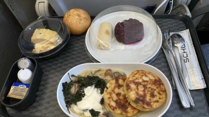 Ich verstehe deinen Punkt nicht, Jakob. Du hast KEINE Wünsche geäußert. Dann bekommst du, was die Galley da hat, quasi „chef’s choice“. Und wenn die Mahlzeit kein Fleisch enthält, dann enthält sie eben kein Fleisch. Ich kenne keine Regel der Küchen dieser Welt, wonach ein Essen erst zum allgemein akzeptierten Essen wird, wenn es Fleisch enthält.