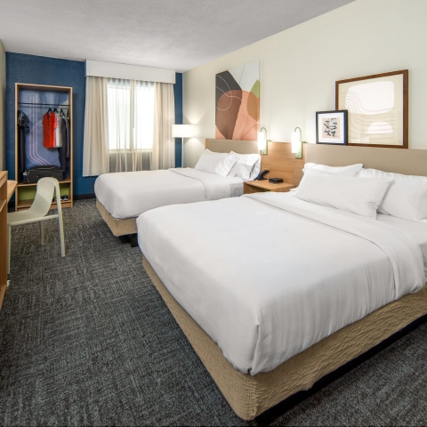 • Durchdachte Einfachheit: Spark by Hilton bietet einfaches, inspiriertes Design mit Farbtupfern und Fröhlichkeit, die die Natur hereinholen. Jedes Hotel vermittelt mit farbenfrohen Außenwänden und belebenden Kunstwerken ein einladendes Gefühl des Ankommens. Der öffentliche Bereich wird über multifunktionale Sitzgelegenheiten verfügen, von Gemeinschaftstischen bis hin zu Schaukelstühlen, die den Gästen viele Möglichkeiten bieten, ihr Frühstück zu genießen, Kontakte zu knüpfen oder den ganzen Tag über zu arbeiten. Die Gästezimmer werden komfortabel und entspannend sein, damit Reisende sich entspannen und für alles, was als nächstes kommt, neue Energie tanken können. Die einfachen, stromlinienförmigen Möbel konzentrieren sich auf praktische Annehmlichkeiten und umfassen einen offenen Schrank, einen Kühlschrank im Zimmer, eine Mehrzweck-Arbeitsfläche und ein helles Badezimmer.
