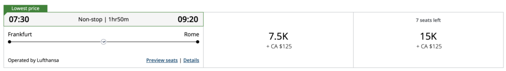 Hier im Beispiel nach Rom 78,75 Euro für die Economy Class Meilen oder 157,50 Euro für die Business Class Meilen. 125CAD sind etwa 85 Euro, sodass man etwa 160 Euro in der Economy Class oder 240 Euro in der Business Class. (Umsteiger mit Swiss oder Austrian Airlines würden nicht mehr kosten!)