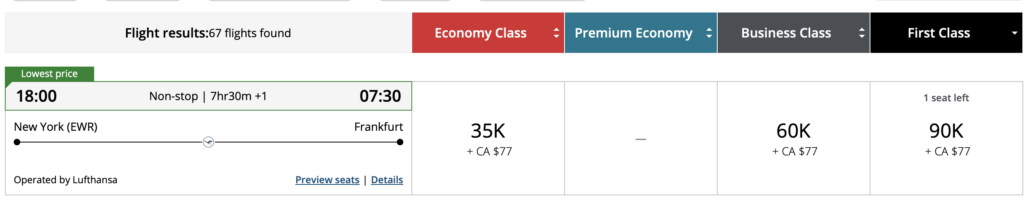 Sehr attraktiv sind auch Flüge z.B. in der Lufthansa First- oder Business Class. Die kurzen Flüge unter 4.000 Meilen, z.B. aus Boston oder New York nach Frankfurt kosten hier in der Business Class 60.000 Meilen (630 Euro) und in der First Class 90.000 Meilen (945 Euro). Steuern und Gebühren sind hier mit gerade mal 55 Euro verschwindend gering.