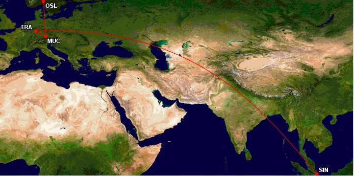 Flüge von Oslo nach Singapur lassen sich im aktuellen Lufthansa First Class Partner Sale ab 2.399 Euro pro Person buchen. Eine direkte Streckenführung von Oslo über Frankfurt nach Singapur bringt Euch leider „nur“ 42.334 Meilen bei SAS. Die fehlenden 2.666 Meilen könnt Ihr entweder mit den Zubringerflügen nach Oslo erfliegen, oder Ihr optimiert Euer Routing nach Singapur.