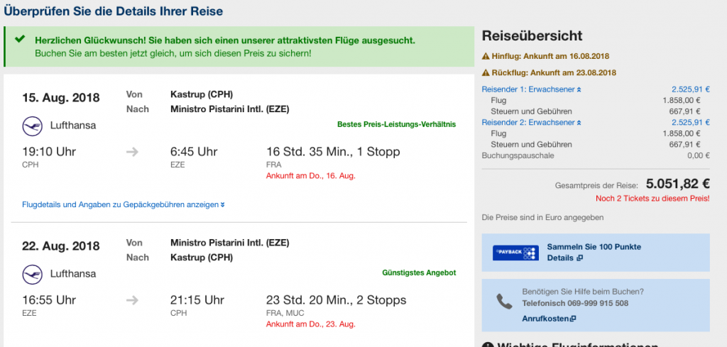 Der Flug von Frankfurt nach Buenos Aires ist der längste Flug im Lufthansa Streckennetz. Entsprechend lassen sich hier auch die meisten Meilen sammeln. Im aktuellen Partnersale lassen sich diese Flüge in der Lufthansa First Class ab 2.520 Euro pro Person Buchen. Ein einfaches Routing über Frankfurt, sichert Euch bereits den Star Alliance Gold Status im SAS Eurobonus Programm, ohne das Zu- und Abbringen nach Oslo bereits mit eingerechnet werden müssen.