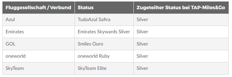 Die portugiesische Fluggesellschaft TAP hat diese Status Match Promotion zum 75. Geburtstag aufgesetzt. Und die Bedingungen sind sehr weit offen. So könnt Ihr mit jedem Status einer Oneworld oder Sky Team Fluggesellschaft den Status Match beantragen. Auch ein paar unabhängige Fluggesellschaften werden akzeptiert.