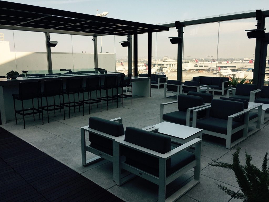 Geboten werden euch kostenlose alkoholische und alkoholfreie Getränke, eine Bar, sowie ein für US-Verhältnisse sehr ordentliches Angebot an Speisen in Büffetform. Platz nehmen könnt Ihr auf einer der zahlreichen Sitzgelegenheiten im Inneren oder auf der Außenterrasse. Selbst eine erfrischende Dusche ist vor dem Flug in einer der Shower-Suiten möglich.