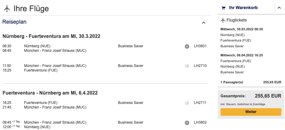 Dabei müsst Ihr einfach nur auf die Angebotsseite klicken, Nürnberg als Startflughafen eingeben und Business Class auswählen. Reisen wie nach Fuerteventura bescheren Euch 4.872 Statusmeilen und sind ab 256€ zu haben. Vorsicht ist in diesem Falle bei dem Rückflug angesagt- es wird eine Übernachtung in München notwendig.