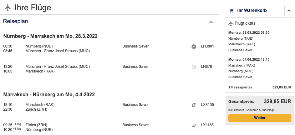 Nach Marokko werden Tarife ab 288€ offeriert. Nicht selten werden Euch bei der Flugsuche auch Routings über ein anderes Drehkreuz (FRA, VIE, ZRH) der LH Group angeboten, dann ist der Zubringer immer per Flugzeug. Wie im Fall nach Marrakesch erhöht sich der Preis um etwa 50€, die Reise findet mit Swiss & Edelweiss statt.