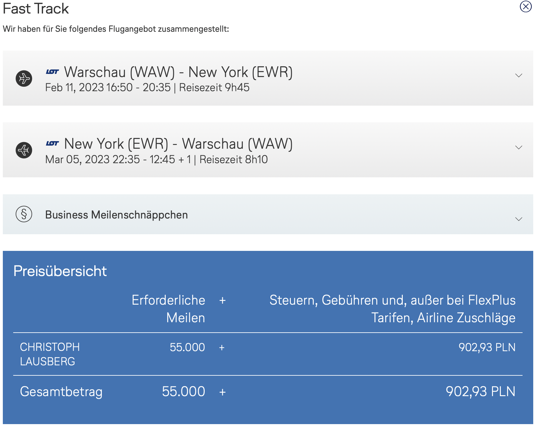 55.000 Meilen für Hin- und Rückflug, anstelle von 112.000 Meilen: