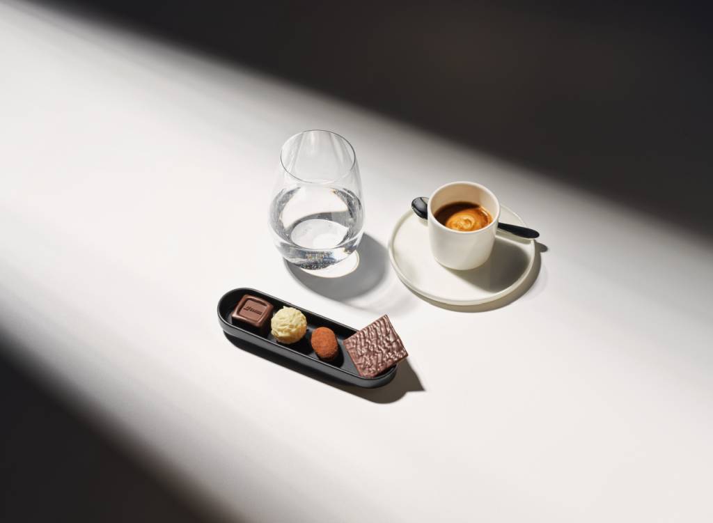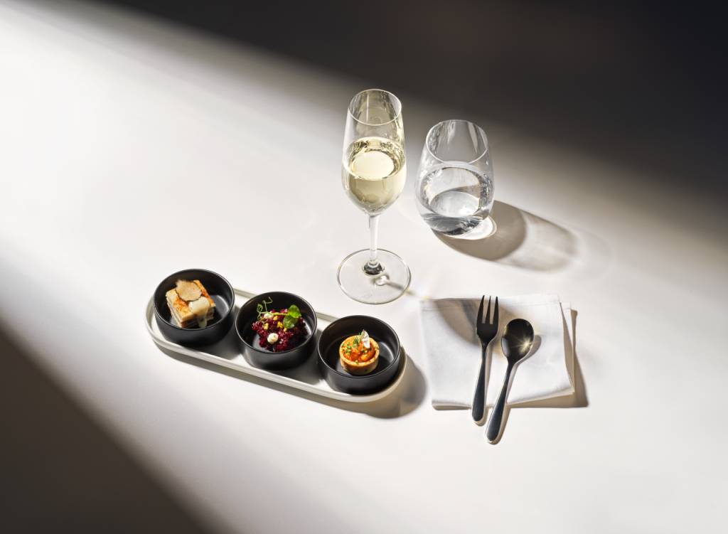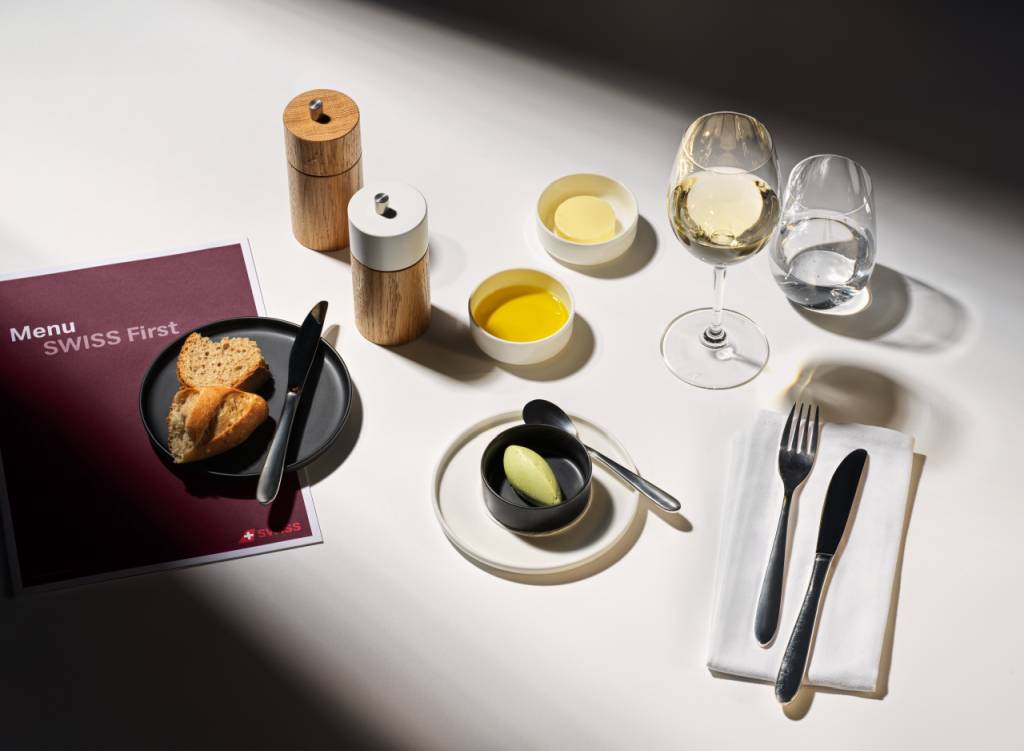 Exklusivität und Individualität sollen im Fokus des Service-Erlebnisses in der First Class stehen. Neben Porzellangeschirr wurde klar die Priorität auf das gesetzt, was im Laufe des Fluges auf den Tisch kommt. Als Pre-Departure-Snack tischt SWISS Apéro-Flûtes der Confiserie Sprüngli auf. First Class Gäste können den Signature Cocktail „SWISS Alpine Essence“ bereits vor dem Abflug genießen oder sich für ein Getränk nach Wahl entscheiden.