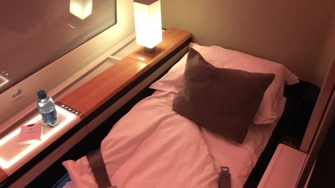 In der Luft erwarten Euch riesige private Sessel in einer privaten Kabine mit nur acht First Class Sitzen. Der Sitz lässt sich auf Wunsch von den Flugbegleitern in ein vollwertiges Bett verstellen. Auch mehrgängige Gourmetmenüs erwarten Euch an Bord der Swiss First Class.