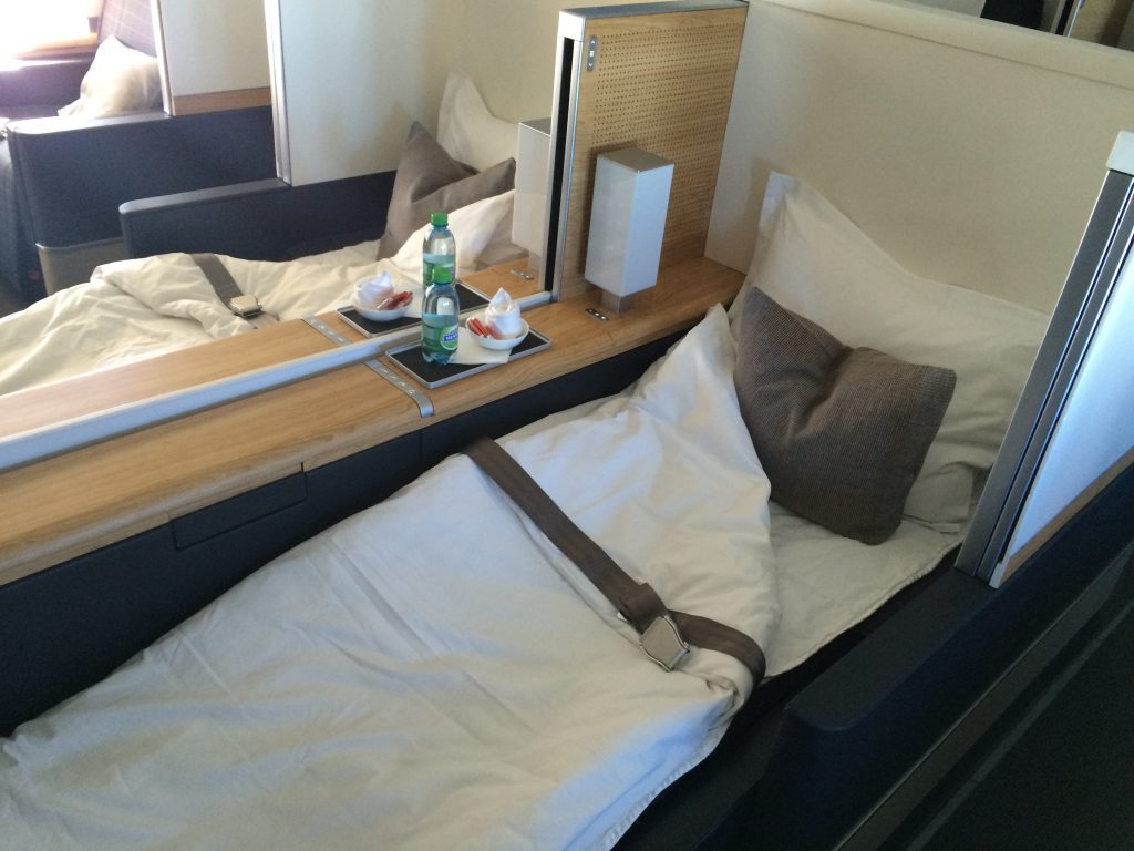 In der Luft erwarten Euch riesige private Sessel in einer privaten Kabine mit nur acht First Class Sitzen. Der Sitz lässt sich auf Wunsch von den Flugbegleitern in ein vollwertiges Bett verstellen. Auch mehrgängige Gourmetmenüs erwarten Euch an Bord der Swiss First Class.