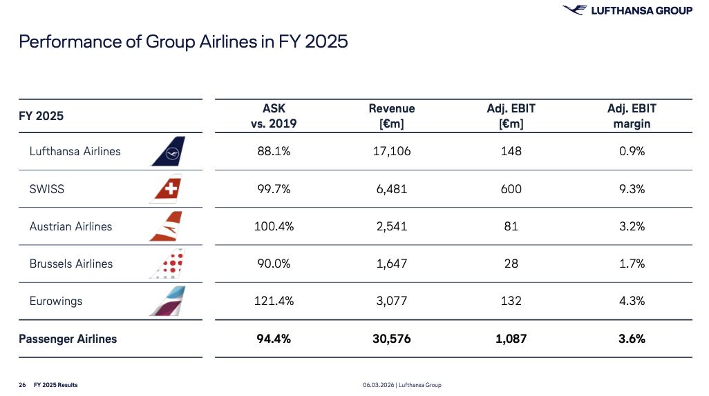 📊 Große Margenunterschiede: SWISS erreicht 2025 eine operative Marge von 9,3 Prozent, während Lufthansa Airlines nur auf 0,9 Prozent kommt.