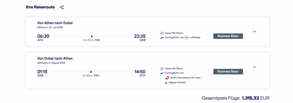 Pro Tipp: Man kann gegen die Zahlung von 75 Euro auch eine Stop Over in Frankfurt, München oder Zürich einlegen und so mit einem Ticket eine Reise nach Dubai und Athen bauen, welche man einen fast beliebig langen Zwischenstop in Frankfurt, München oder Zürich einlegen kann.