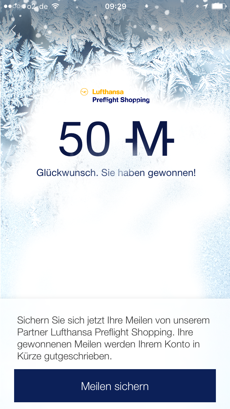 Der Miles and More Win Winter sollte anschließend direkt erscheinen. Nachdem Ihr einmalig die Teilnahmebedingungen akzeptiert habt, könnt Ihr jeden Tag neue Meilenpakete durch das Wischen auf dem Bildschirm gewinnen. Die Meilen werden Eurem Konto sofort gutgeschrieben.