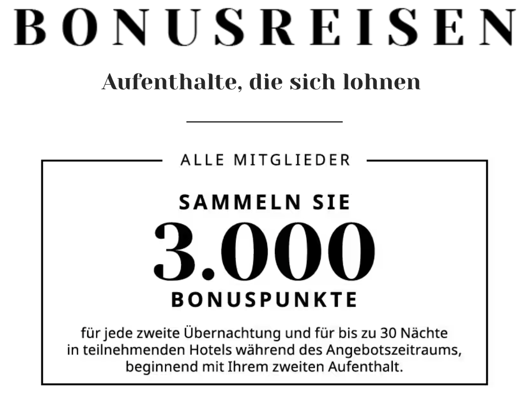 Melden Sie sich für Bonusreisen an, um neue Erlebnisse zu entdecken, unbekannte Wege zu beschreiten und für lohnende Erinnerungen zu sorgen. Mit Bonusreisen sammeln Sie während des Angebotszeitraums 3.000 Bonuspunkte für jede zweite qualifizierende Übernachtung und für bis zu 30 Nächte ab Ihrem zweiten anrechenbaren Aufenthalt in mehr als 1.200 Hotels bei über 25 Marken weltweit, darunter teilnehmende Hotels von Andaz, Park Hyatt, Hyatt Regency, Thompson Hotels und mehr.