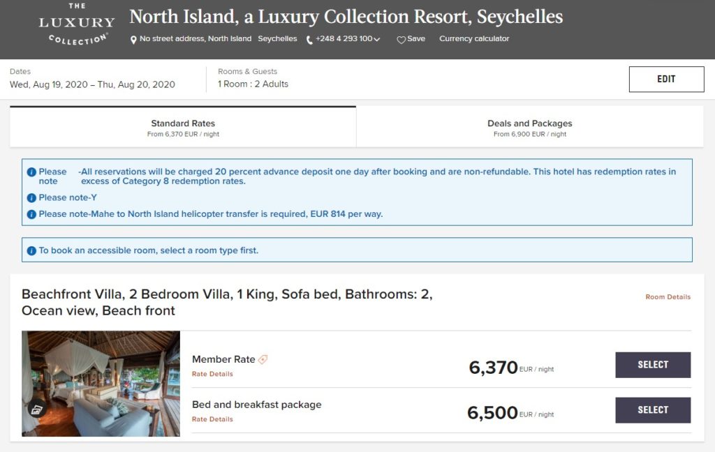 Das vermutlich luxuriöseste und teuerste Marriott Resort ist nun mit Punkten buchbar. Es handelt sich dabei um das North Island – The Luxury Collection Resort auf den Seychellen. Da das Resort so dermaßen unverschämt teuer ist, musste extra eine neue Punkte-Kategorie geschaffen werden. Im letzten Jahr erst wurde eine neue Kategorie acht eingeführt, in der Ihr bis zu 100.000 Punkte für eine Übernachtung aufbringen müsst. Zu wenig für das North Island, welches euch nun 365.000 Punkte pro Übernachtung abverlangt.