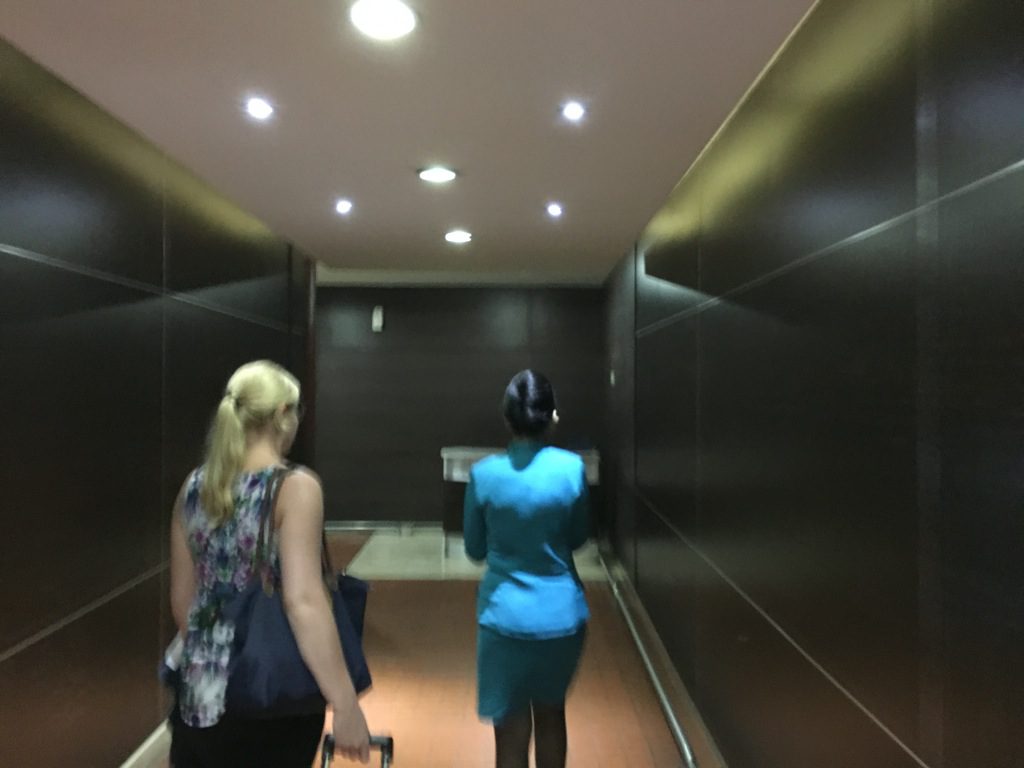Nachdem wir uns in der Lounge niedergelassen hatten, brachte unsere Eskorte unsere Pässe und Bordkarten ohne uns zu einem Zöllner für die Ausreise. Fünf Minuten später wurden uns unsere Pässe und Bordkarten in die Lounge gebracht und auch die neuen Bagtags wurden uns überreicht.