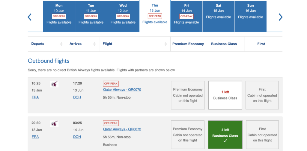 Wer z.B. von Frankfurt oder auch Zürich, Düsseldorf, Amsterdam oder London nach Doha fliegen will, für den macht das Programm von Cathay Pacific leider keinen Sinn mehr, da die Flüge hier zu lang sind und damit deutlich teuer. Hier wird das Programm von British Airways, der Executive Club sehr attraktiv, denn für 43.000 Avios (die Prämienmeilen von British Airways), kann man z.B. den Prämiemflug in der Qatar Airways QSuite von Frankfurt nach Doha buchen.