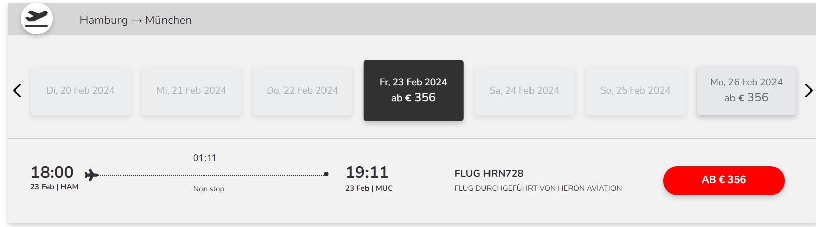 - HRN728 | Hamburg (HAM) – München (MUC) | 18:00 – 19:11 Uhr | MO/MI/FR