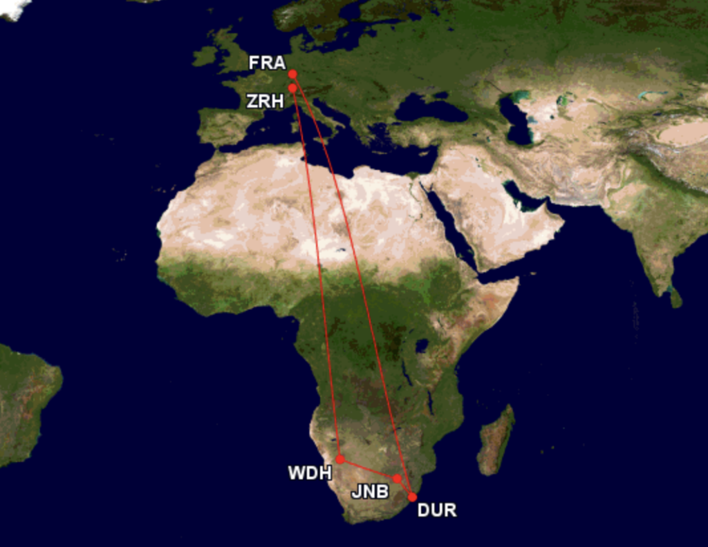 Bei dem Zwischenstopp in Windhoek oder Durban müssen die Passagiere nicht aussteigen, dennoch verlängert sich die Reisezeit drastisch auf über 13 Stunden. Dabei bevorzugen Lufthansa und Swiss wohl den Tankstop in Durban, denn hier ist der Umweg kürzer, als über Windhoek, was man auch schon genutzt hat.