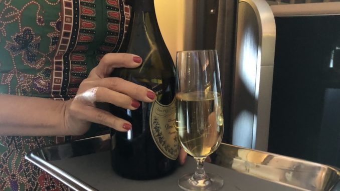 Auf Langstreckenflügen bekommt man bei den meisten Airlines auch als Economy-Class-Passagier ein Glas Wein oder Bier zur Mahlzeit. In den vorderen Klassen gehört Champagner meist zum festen Bestandteil des Getränkeeangebots. Je nach Fluggesellschaft und Strecke können alkoholische Getränke kostenlos oder kostenpflichtig sein – einige Airlines verzichten jedoch vollständig auf den Ausschank von Alkohol.
