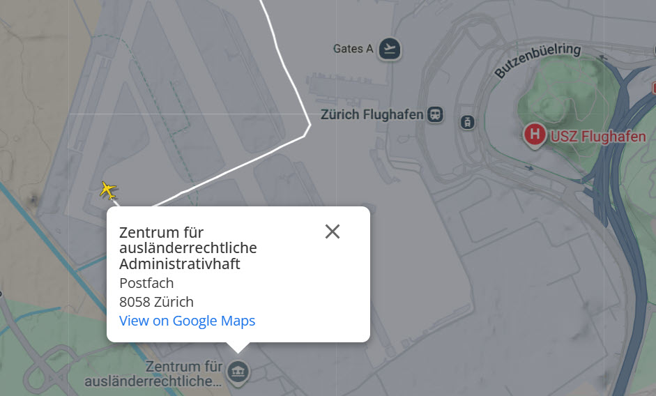 Dafür spricht auch die ungewöhnliche Außenposition der Boeing 737 MAX 8. Denn statt irgendwo am Terminal oder zumindest auf einer der regulären Parkpositionen auf das Boarding für den Weiterflug zu warten, parkte die Maschine unweit des Ausschaffungsgefängnisses direkt im Süden des Flughafens.