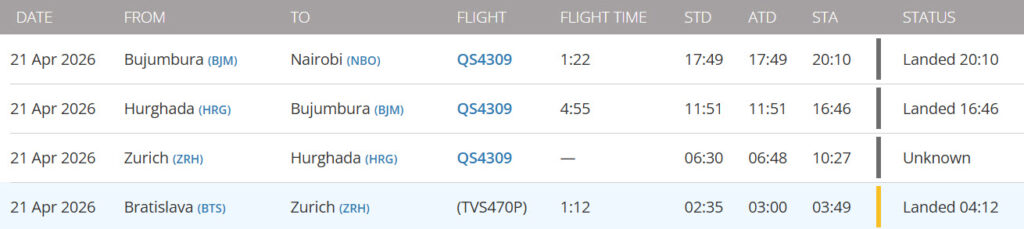 So ist die OK-SWC noch ohne reguläre Flugnummer in Zürich gelandet und scheint dementsprechend als Ferryflug eingesetzt worden zu sein. Erst als die 737 Zürich um 6:48 Uhr wieder verließ, tauchte sie auf Flightradar24.com unter der Flugnummer QS4309 auf.