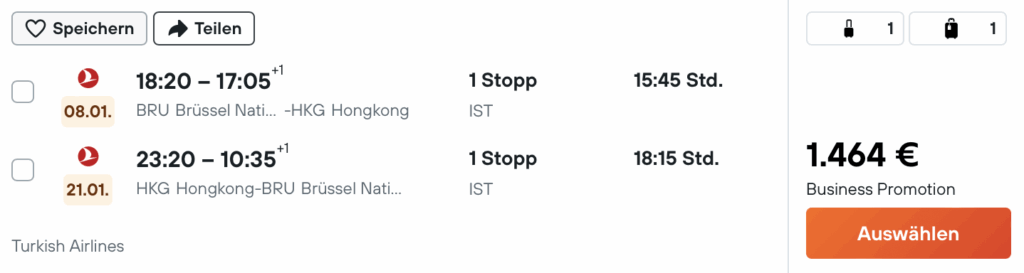 Turkish Airlines hat immer wieder sehr attraktive Business Class Angebote im Angebot, wie hier nach Hongkong. Diese günstigen Preise, zusammen mit dem sehr guten Produkt von Turkish Airlines und auch dem attraktiven Meilenprogramm, machen das Gesamtpaket einfach spannend.