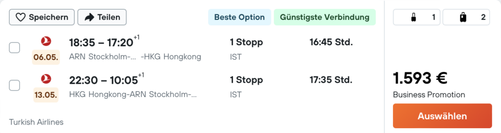 In der Turkish Airlines Business Class kann man aktuell erstaunlich günstig von Stockholm nach Hongkong fliegen. Gerade da es für Turkish Airlines einige Fans gibt, die die Airline aufgrund des sehr guten Business Class Produktes und auch wegen des hauseigenen Vielfliegerprogramms sehr mögen, sind diese Tarife sicherlich sehr spannend.