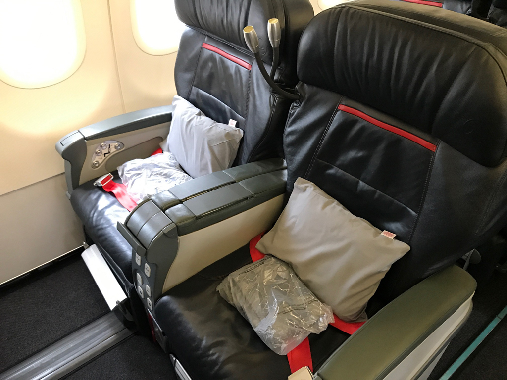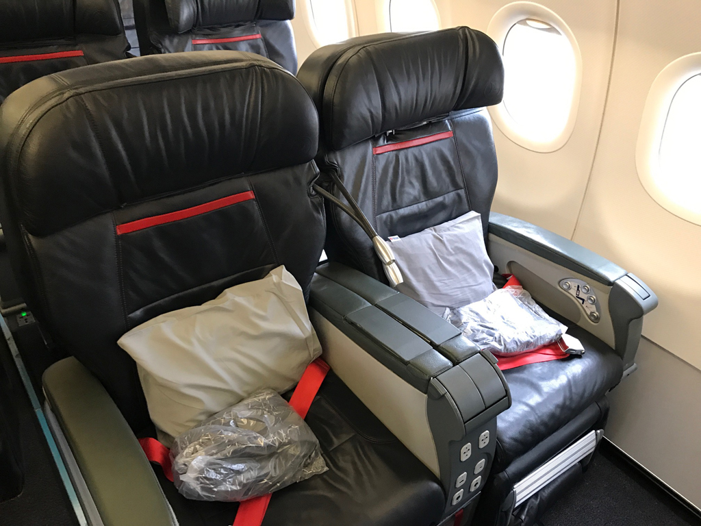 Während des Einsteigens konnte ich einen kurzen Blick in die Business Class werfen, die im A321 mit breiten Ledersesseln (inkl. Fußstütze) in einer 2-2-Anordnung ausgestattet ist. Im Vergleich zu vielen anderen europäischen Airlines, die in Schmalrumpfmaschinen keine „richtige“ Business Class verbaut haben, also ein deutlicher Pluspunkt.