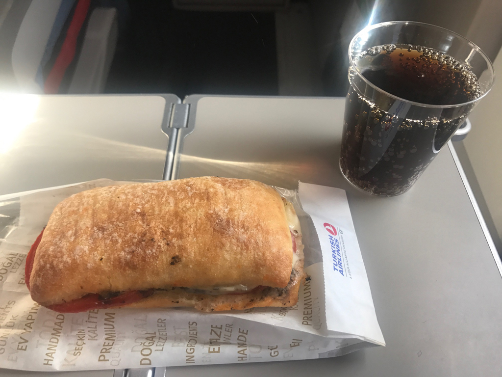 Auf meinem gut einstündigen Inlandsflug wurde ein Sandwich, das mit Tomate und Käse belegt war, gereicht.