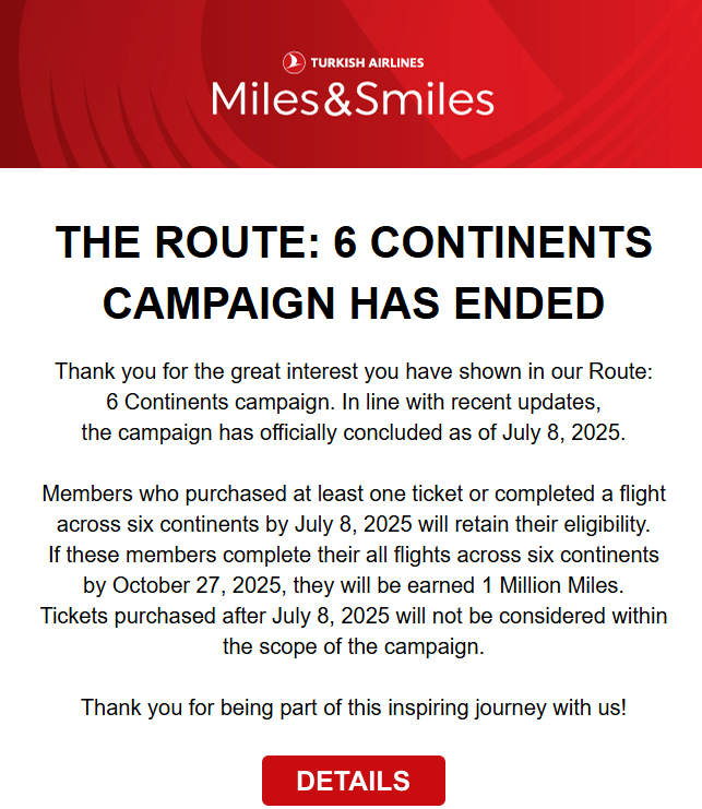 Dass die Ziele der Promotion angepasst werden können, das hat Turkish Airlines vorab transparent gemacht. Das vorzeitige Ende des Buchungszeitraums jedoch nicht. Per E-Mail informierte die Fluggesellschaft ihre Miles & Smiles nun, dass nur die Personen an der Promotion teilnehmen können, die bis zum 8. Juli 2025 zumindest ein Flugticket gekauft oder einen Flug wahrgenommen haben. Für sie gelten weiterhin die angegebenen Bedingungen. Wer etwas mehr Zeit in die Planung gesteckt hat und jetzt erst loslegen wollte, geht nun leer aus.