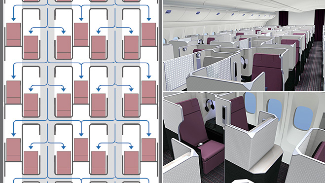 Ein weiteres Gerücht aus der Vergangenheit besagte aber, dass Turkish Airlines in der Business Class weiterhin auf eine 2-3-2 Anordnung setzen wolle, aber gleichzeitig jedem Passagier direkte Gangzugang ermöglichen will.