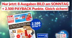 Mit dem 8 Wochen Abo der Bild am Sonntag könnt Ihr 2.000 Paybackpunkte/ Miles&More Meilen mitnehmen. Bei Zahlung per Bankeinzug, erhaltet Ihr 500 Punkte extra. In Summe also 2.500 Paybackpunkte.