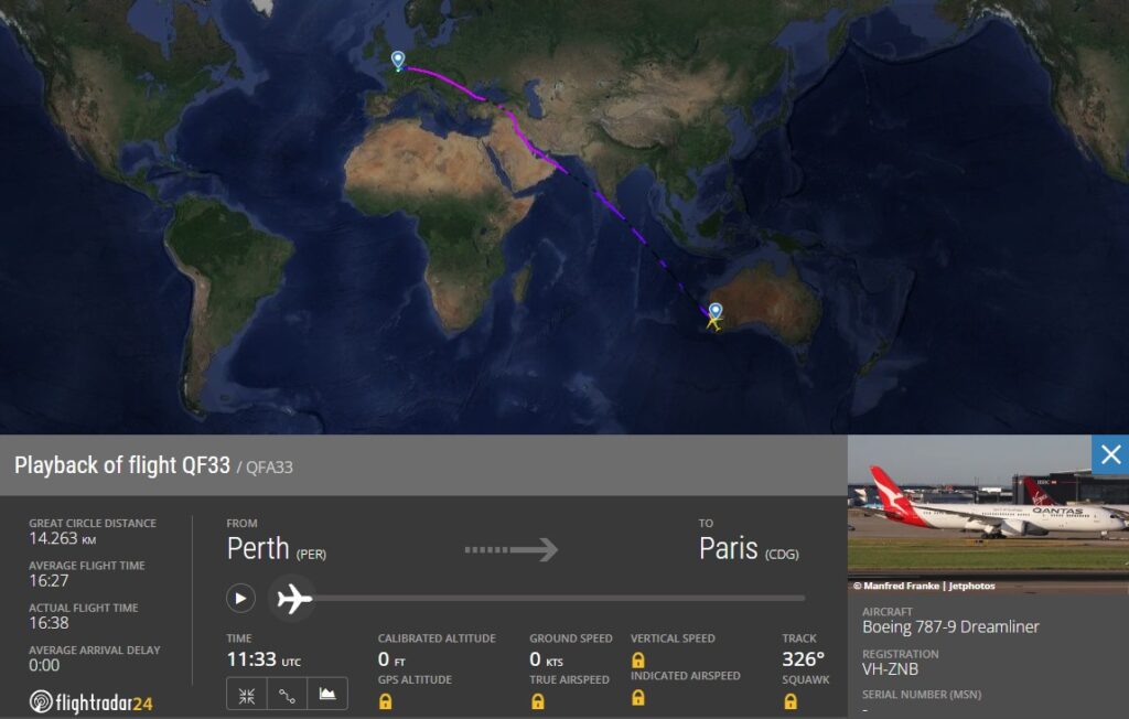 - QF33 | 19:35 Uhr Perth (PER) – 06:55+1 Paris (CDG) | Boeing 787-9 (B789)
