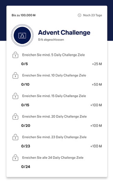 - Level 6: Absolvieren Sie alle 24 Daily Challenges und nehmen Sie an der Verlosung von 100.000 Meilen teil.