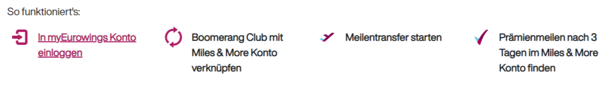 Doch bevor das geschieht, sollen Nutzer Ihre Boomerang Club Meilen noch in Sicherheit bringen. Dafür wurde eigens ein Transfer zu Miles & More eingerichtet. Bei diesem Transfer könnt Ihr zwei Boomerang Club Meilen zu einer Prämienmeile bei Miles and More machen. Zumindest unter normalen Bedingungen.