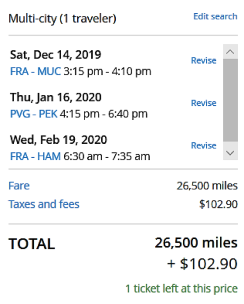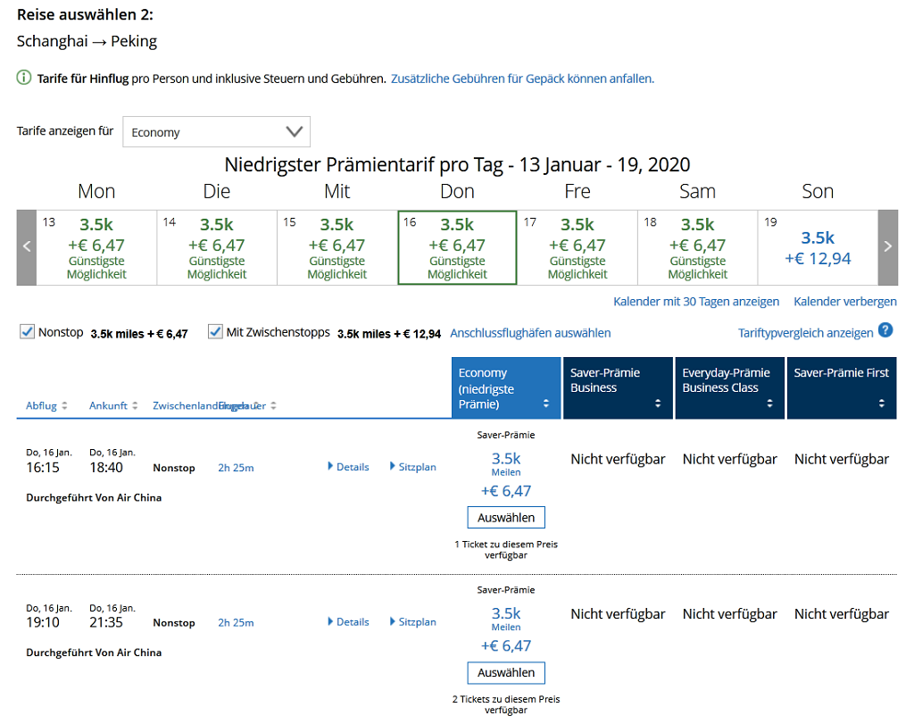 In meinem Beispiel wären es Flüge mit der Lufthansa von Frankfurt nach München (Hinflug) und von Frankfurt nach Hamburg (Rückflug). Dazwischen ein Flug von Shanghai nach Peking. Für alle Flüge in der Economy Class zahlt man ab 30 Tage vor Abflug 16k Meilen. Ein sehr fairer Deal.