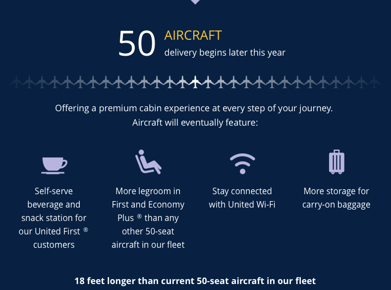 United wird ab diesem Jahr von Bomadier 50 Exemplare eines neuen Flugzeuges geliefert bekommen. Bei dem Canadair Jet CRJ550 handelt es sich im wesentlichen um einen CRJ700, welcher für 76 Passagiere zugelassen ist. Allerdings wird die United CRJ550 mit nur 50 Sitzen ausgestattet und auch hierfür zugelassen.
