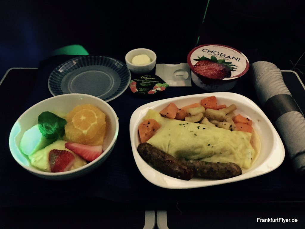 Ich habe auf diesem Flug das Frühstück bewusst verschlafen, um möglichst erholt in Frankfurt anzukommen. Auch in der First Class wird das selbe Frühstück, wie in der Business Class serviert. Hier ein Bild von einem anderen Flug.