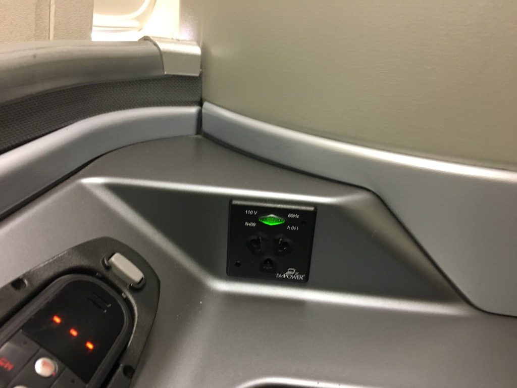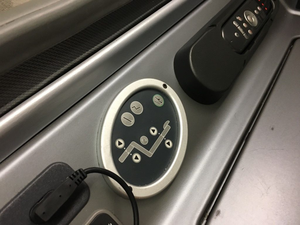 Auf der großen Ablagefläche am Fenster befindet sich auch die Sitzverstellung für den Sitz, die Fernbedienung für das IFE , sowie ein USB Anschluss und eine 110 Volt Steckdose, sowie die Kopfhöreranschlüsse.