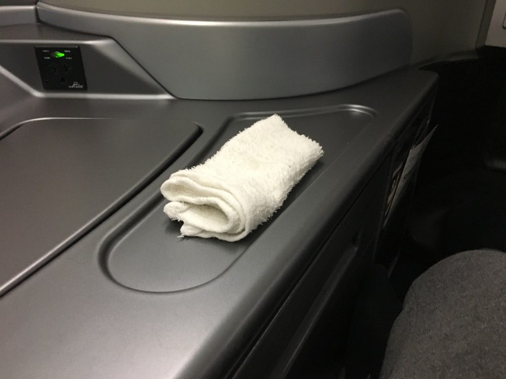 Nachdem wir mit etwa 45 Minuten Verspätung endlich starten konnten, wurde auch sehr zügig mit dem Service begonnen. Zuerst wurden heiße Tücher verteilt.